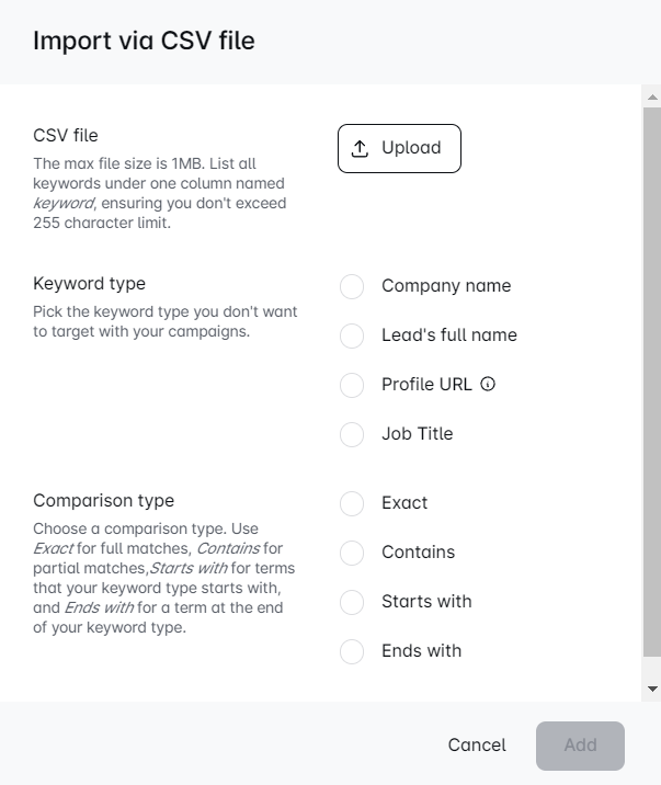 - Exact - Add a term that fully matches the selected blacklist type to avoid it. This means that the value from the CSV file will be added to the blacklist exactly as it is written. For example, if the company name you want to avoid has an LLC on their Linkedin, you need to add the LLC to the company name in the CSV file. This also refers to the Profile URLs you upload via CSV file. You can only select the Exact comparison type with this item.