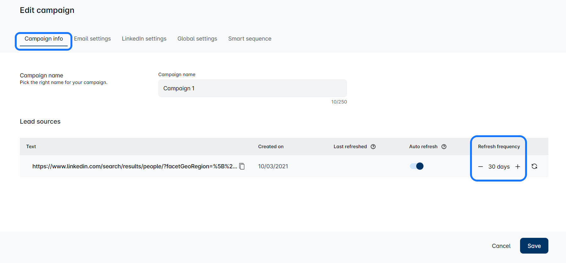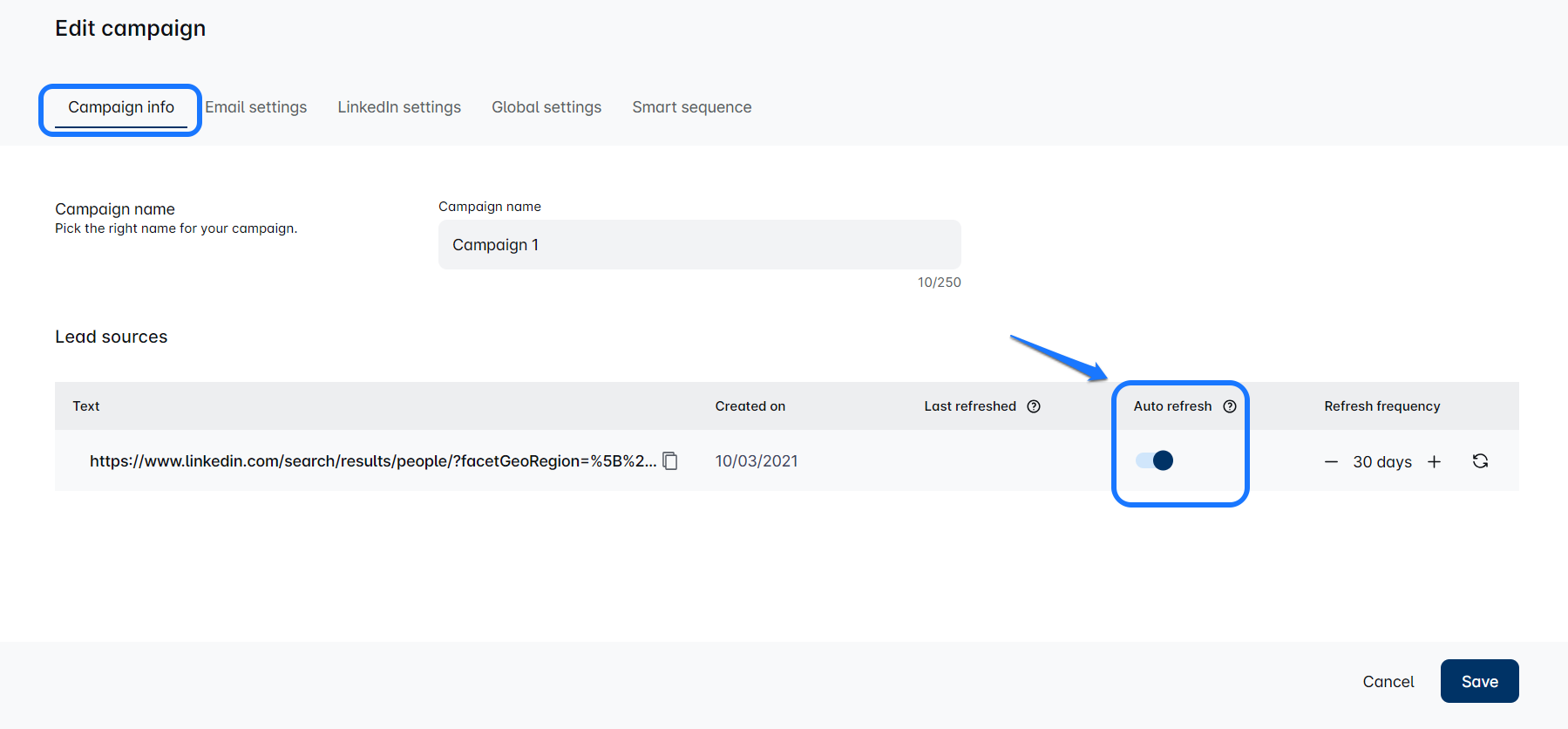 On the tab 'Campaign info', you will see the option to enable Refresh search here: