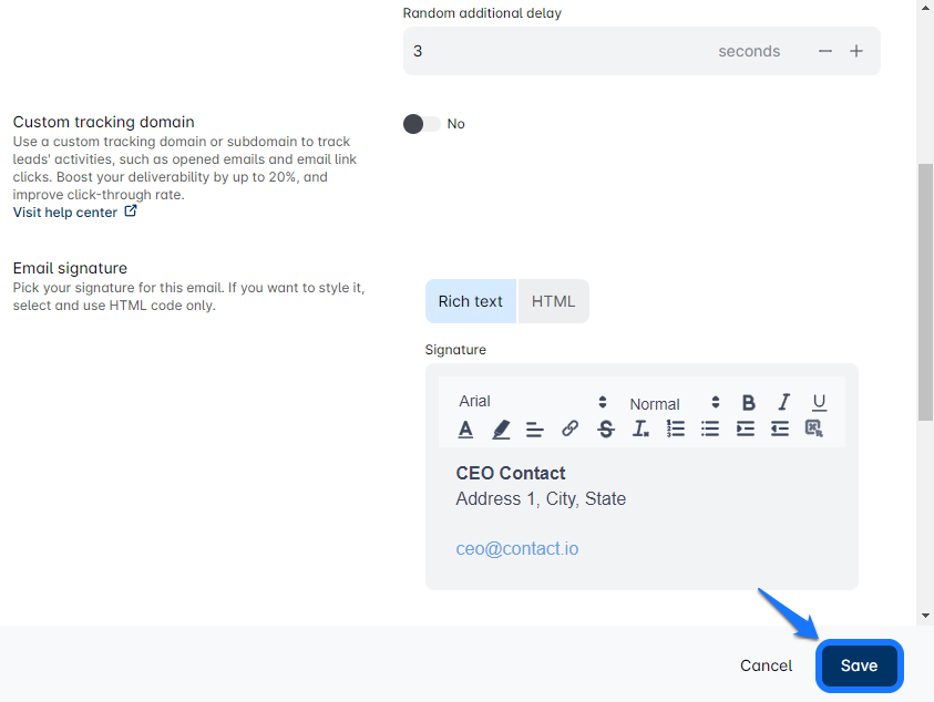 Here, you can change the sender's name, adjust campaign settings, set a custom tracking domain, update your signature, and even add BCC recipients. 🖊️