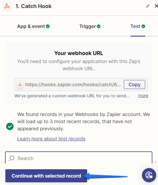 - Click “Continue with selected record” in Zapier to move on to the next step.