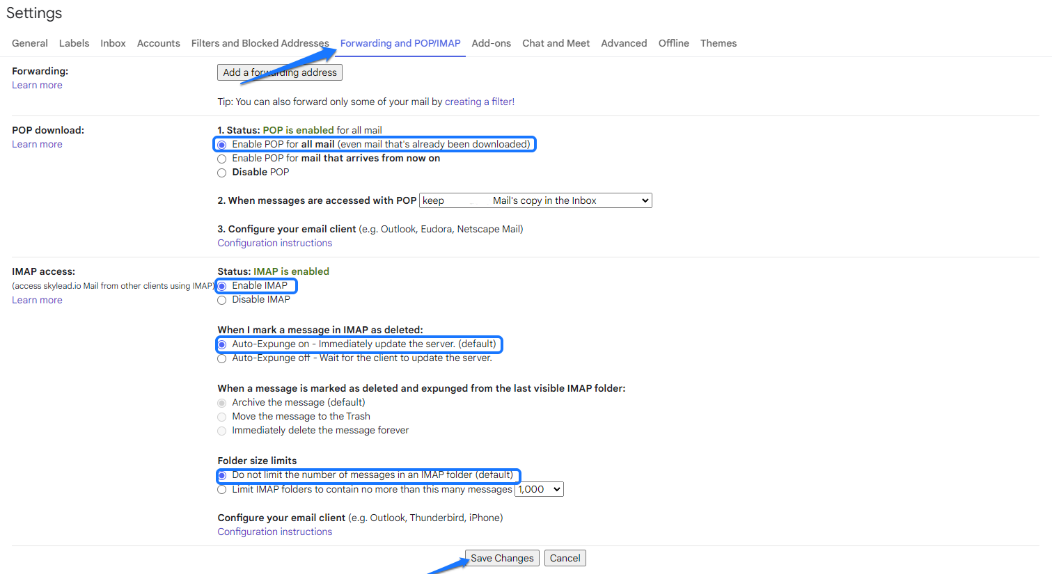 Next, click on the Forwarding and POP/IMAP tab. Enable these options: