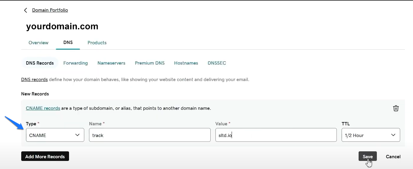 - Since we’re creating a subdomain, you need to use the prefix you’ve created (e.g., track, click, go, etc.) and paste it into Leadfeedmedia under the Your subdomain field.